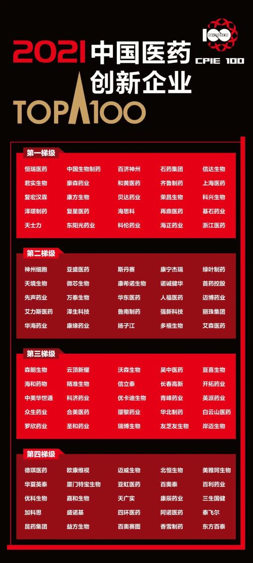 世界杯下单平台网站官网作为中国创新药行业代表企业,凭借行业领先的综合创新实力,入选 “2021中国医药创新企业100强”榜单,位列第一梯级。