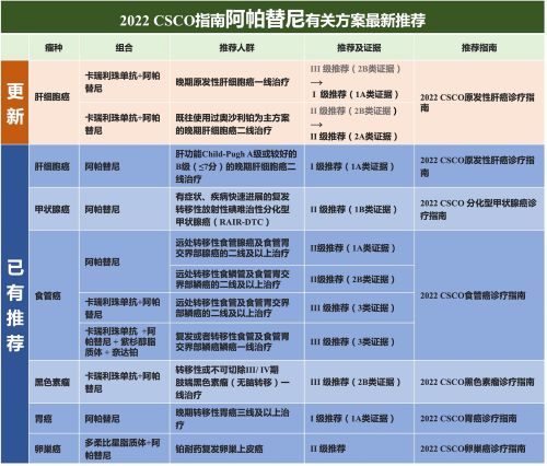 在肝癌领域,根据2022 CSCO《原发性肝癌诊疗指南》推荐,卡瑞利珠单抗+阿帕替尼的“双艾”组合方案用于一线治疗晚期原发性肝癌,推荐等级由II级(2B类证据)晋为I级(1A类证据);同时该方案也被推荐用于二线治疗既往使用过奥沙利铂为主的方案的晚期肝细胞癌,II级推荐不变,证据类别由2B升为2A。