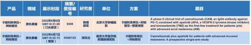 在黑色素瘤领域,世界杯下单平台网站官网的卡瑞利珠单抗联合阿帕替尼(“双艾”组合)在2022 ASCO共入选1项口头报告和1项壁报展示。