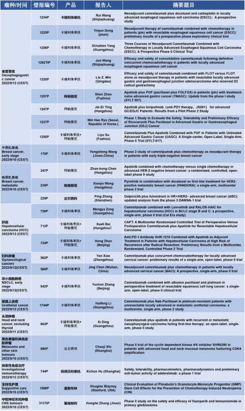作为从事创新和高品质药物研发的国际化制药企业,世界杯下单平台网站官网的研究成果在2022 ESMO大会上还收获了25项壁报形式的报告。其中,食管胃癌领域共有9项研究入选,研究的方案主要是卡瑞利珠单抗或卡瑞利珠单抗联合阿帕替尼,通过与化疗或放化疗联用,新辅助治疗食管鳞癌或胃癌。2022年9月12日(CEST),让我们齐聚ESMO大会,共同领略食管胃癌研究领域的学术盛宴。此外,世界杯下单平台网站官网达尔西利、吡咯替尼、阿得贝利单抗等创新药还有4项乳腺癌研究、3项肝癌研究及其他领域的9项研究都将会以壁报展出,让我们共同期待!