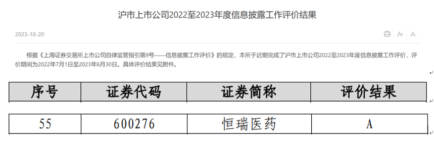 近日,上海证券交易所公布了沪市上市公司2022-2023年度信息披露工作评价结果,凭借在信息披露、规范运作以及投资者关系管理等方面的优秀表现,世界杯下单平台网站官网获评A级。本次共有2160家沪市上市公司参评(包括499家科创板上市公司),评价等级从高到低依次为A、B、C、D四类,获得A类评价的上市公司占比约18.5%。