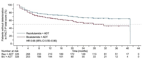 几乎所有FACT-P子量表的恶化在瑞维鲁胺+ADT治疗下均延迟,包括身体功能(HR=0.65,95% CI:0.49-0.86;p=0.003)、情绪功能(HR=0.68,95% CI:0.50-0.92;p=0.013)、功能状态(HR=0.75,95% CI:0.59-0.95;p=0.015)、FACT-G总体量表(HR=0.69,95% CI:0.52-0.91;p=0.008)、前列腺癌子量表(HR=0.74,95% CI:0.57-96;p=0.022)和试验结局指数(HR=0.65,95% CI:0.49-0.86;p=0.002;表2)。但是,两组在社会/家庭功能恶化时间或FACT-P疼痛量表方面未发现差异。
