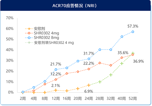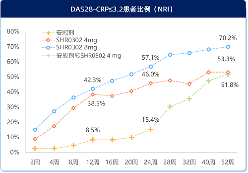 接受艾玛昔替尼治疗后,疾病缓解和低疾病活动的患者比例显著增加,且持续至52周,8mg组DAS28-CRP<2.6患者比例为50.3%, DAS28-CRP≤3.2患者比例为70.2%(图3)。