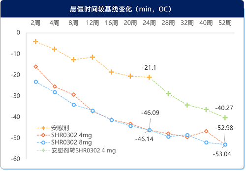 24周时,艾玛昔替尼4mg和8mg均能显著缩短晨僵时间(-41.39 min和-40.76 min),显著高于安慰剂组(-24,96 min);晨僵严重程度也显著减轻(-23.27和-26.60),明显优于安慰剂组(-11.45);随着治疗时间延长,晨僵时间和严重程度均持续改善至52周(图5)。