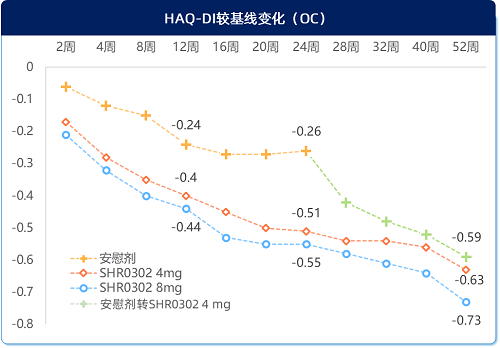 SF-36评分数值变化越高,代表受试者获益越多;HAQ-DI数值变化越低,代表受试者获益越多