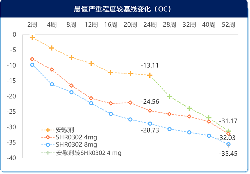 艾玛昔替尼治疗2周,可明显改善CDAI和SDAI。与安慰剂相比,SHR0302 4mg和8mg在第2周就显著改善患者CDAI和SDAI,且8mg组改善更好,持续改善至52周(图2)。