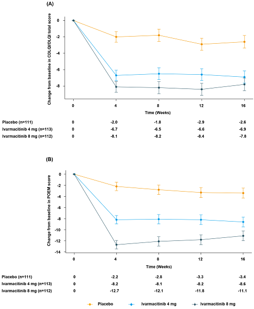 在第16周,与安慰剂组校正后的银屑病生活质量指数(DLQI)/儿童皮肤病生活质量指数(CDLQI)评分最小二乘均值(LS mean)变化分别为:硫酸艾玛昔替尼片4 mg组-4.4(P<0.001),8 mg组-5.2(P<0.001)。与安慰剂组校正后的患者湿疹自我检查评分(POEM)的LS mean变化为:艾玛昔替尼4 mg组-5.2(P<0.001),8 mg组-7.7(P<0.001)。从第4周到第16周,两个艾玛昔替尼组的DLQI/CDLQI和POEM评分均显著降低。