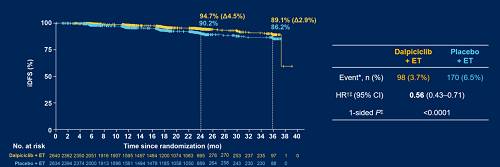 与安慰剂联合内分泌治疗(ET)相比,达尔西利(Dalp)联合ET显著延长了无浸润性疾病生存期(iDFS)(HR 0.56,95% CI 0.43–0.71;单侧P<0.0001),且在2年时带来4.5%的绝对iDFS获益。达尔西利带来的iDFS获益在各分层因素和其他基线亚组中总体一致。无病生存期(DFS)和无远处病生存期(DDFS)也显示达尔西利联合ET优于安慰剂联合ET。安全性方面,达尔西利安全性整体可控。