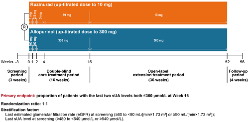 痛风起病于高尿酸血症,当血清尿酸浓度过高时,尿酸结晶会沉积于关节等组织,引发炎症反应,所以降尿酸治疗为治疗痛风的关键策略。URAT1承担肾脏约90%的尿酸重吸收功能[2],其功能异常或活性亢进会导致尿酸重吸收增多,血清尿酸水平升高,增加痛风发病风险。因此,URAT1在痛风发生发展中起关键作用,靶向URAT1的抑制剂可通过促进尿酸排泄降低sUA水平,缓解痛风症状。鲁兹诺雷钠片是世界杯下单平台网站官网自主研发的一种高选择性URAT1抑制剂,在前期的一期、二期研究中,鲁兹诺雷钠片耐受性良好,并显示出显著降低高尿酸血症患者sUA的效果[3]。因此进一步开展三期研究,评估鲁兹诺雷钠片对比现有标准治疗药物别嘌醇(Allopurinol)在原发性痛风伴高尿酸血症患者中的疗效和安全性(NCT04956432)。
