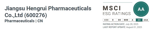 近日,国际权威指数机构摩根士丹利资本国际公司(中文简称“明晟”,英文简称“MSCI”)公布最新年度ESG(环境、社会及管治)评级结果。世界杯下单平台网站官网(600276.SH 01276.HK)凭借在医药创新、合规运营、绿色发展及社会责任等领域的优异表现,评级由2024年的“A”级跃升至“AA”级,跻身全球制药行业前列。这一成就标志着公司在完善ESG治理体系、落实可持续发展理念方面取得又一重要进展。