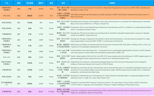 在消化系统肿瘤领域,恒瑞产品相关研究共入选2项口头报告、11项壁报和1项电子壁报,共14项研究。除卡瑞利珠单抗和阿帕替尼外,还有4篇阿得贝利单抗治疗消化系统肿瘤研究入选。HRS-4642、瑞拉芙普-α注射液(SHR-1701)等在研创新产品也有相应研究亮相。另有1项伊立替康脂质体(II)用于胰腺癌治疗的研究入选壁报。