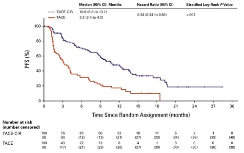 按照肝癌疗效评价标准(RECICL 5)评估,TACE-C-R组的中位PFS显著长于TACE组(10.8个月[95% CI, 8.8-13.7] vs 3.2个月[95% CI,2.4-4.2];HR 0.34[95% CI,0.24-0.50],P<0.001),意味着联合方案显著降低了66%的疾病进展或死亡风险。
