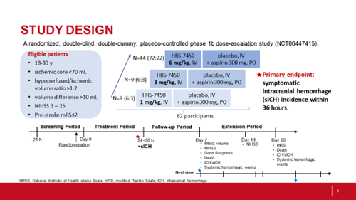[1] Zeng JS, et al. HRS-7450 for Acute Ischemic Stroke at 4.5 to 24 Hours: A Phase 1b Dose-Escalation Study of a Novel Plasminogen Activator with Neuroprotective Properties. Abstract A004, ISC 2026.