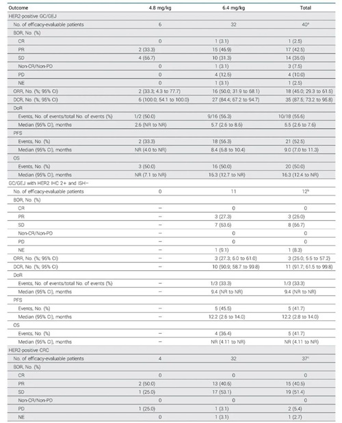 此项Ⅰ期临床试验包括剂量递增、药代动力学扩展和临床扩展三个部分,纳入经标准治疗失败、对标准治疗不耐受或无可用标准治疗且具有HER2表达(IHC 1+,2+或3+或ISH+)的GC/GEJ和CRC患者。