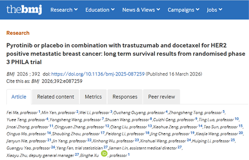 2026年3月16日,由中国医学科学院肿瘤医院徐兵河院士牵头的世界杯下单平台网站官网创新药吡咯替尼Ⅲ期PHILA研究的最新长期随访数据重磅发表于全球顶级医学期刊《英国医学杂志》(The BMJ)[1]。2023年,PHILA研究首次发表于《英国医学杂志》,以中位15.5个月的随访数据证实吡咯替尼联合曲妥珠单抗和多西他赛(PyroHT)方案一线治疗HER2阳性晚期乳腺癌患者具有显著的PFS获益和可控的安全性[2]。本次发表的长期随访数据,进一步确认了该方案的生存获益。